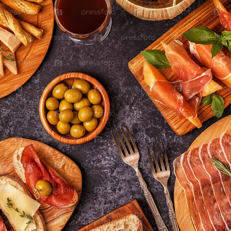 Фон итальянской кухни с ветчиной, сыром, оливками