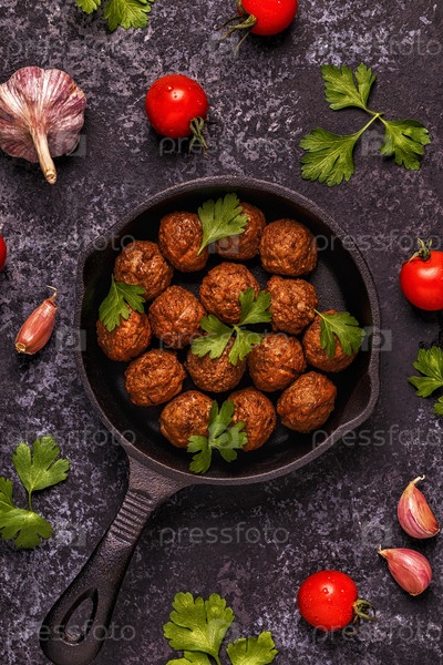 Жареные фрикадельки с помидорами, чесноком и петрушкой