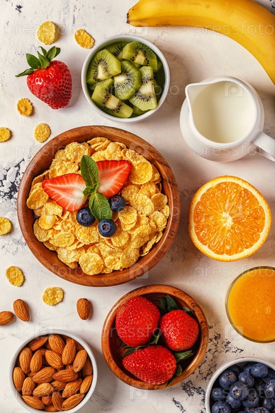 Здоровый завтрак - миска кукурузных хлопьев, ягод и фруктов