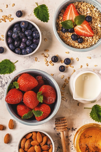 Здоровый завтрак - миска овсянки, ягод и фруктов, вид сверху
