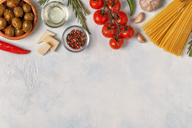 Фон итальянской кухни с макаронами, специями и овощами