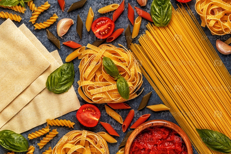 Фон итальянской кухни с макаронами, специями и овощами