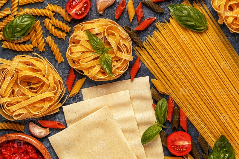 Фон итальянской кухни с макаронами, специями и овощами