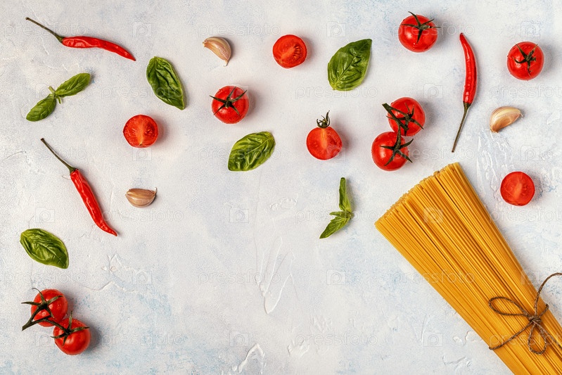 Фон итальянской кухни с макаронами, специями и овощами