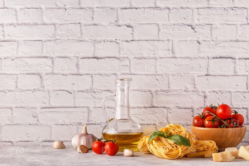 Продукты для приготовления - макароны, помидоры, чеснок, оливковое масло, базилик