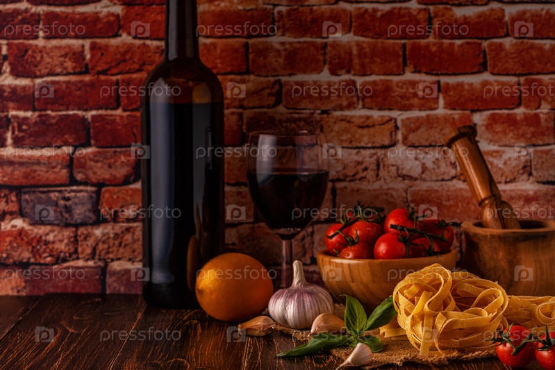 Продукты для приготовления пищи - макароны, помидоры, чеснок, оливковое масло и красное вино