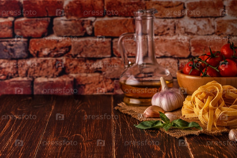 Продукты для приготовления пищи - макароны, помидоры, чеснок, оливковое масло и красное вино