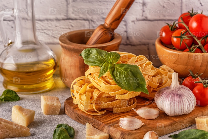 Продукты для приготовления - макароны, помидоры, чеснок, оливковое масло, базилик