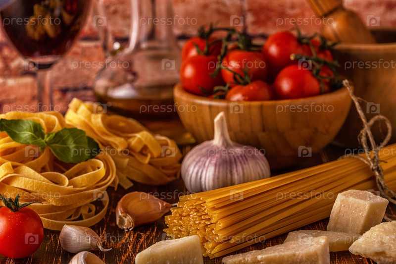 Продукты для приготовления пищи - макароны, помидоры, чеснок, оливковое масло и красное вино