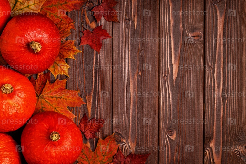 Осенний фон с цветными листьями и тыквами на деревянном фоне