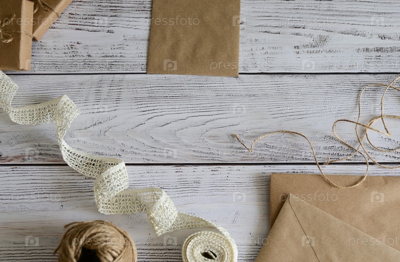 Розовые и голубые цветы, открытка, крафт, шпагат. Макет женского дня или Дня матери, Дня святого Валентина, плоский, вид сверху