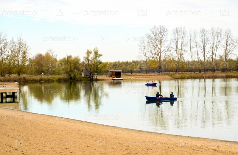 Осенний лес с лодкой. Отражение апельсиновых и зеленых деревьев в озере