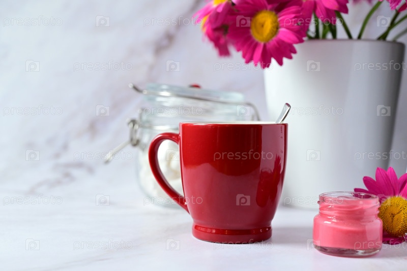 Красная кружка с чаем на фоне букета красных цветов