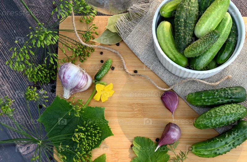 Набор ингредиентов для засолки огурцов, маринованные огурцы, рассол