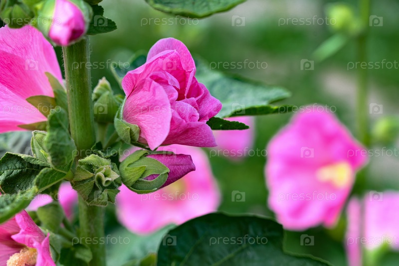 Мягкий фокус. Крупный план красивых цветов и бутонов лаватера триместриса. Однолетняя мальва. Цветок лаватера триместрис в саду. Крупный план розовой мальвы. Мальва триместрис. Цветы в цвету. Лето