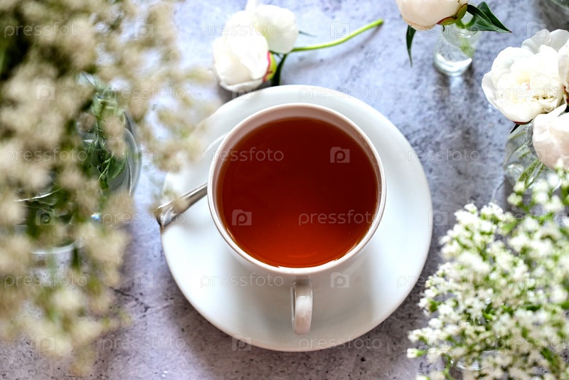 Свежая белая гипсофила, пионы на белом фоне. Дата свадьбы. Приглашение на праздник. Поздравление. Пустое место для текста. Вид сверху