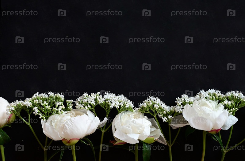 Свежие белые пионы на черном темном фоне. Открытка с соболезнованиями. Дата свадьбы. Приглашение на праздник. Поздравление. Пустое место для текста. Вид сверху. Он лежал ровно