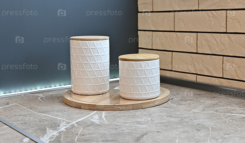 Серые керамические банки для хранения с крышками из бамбукового дерева в скандинавском стиле на белом фоне