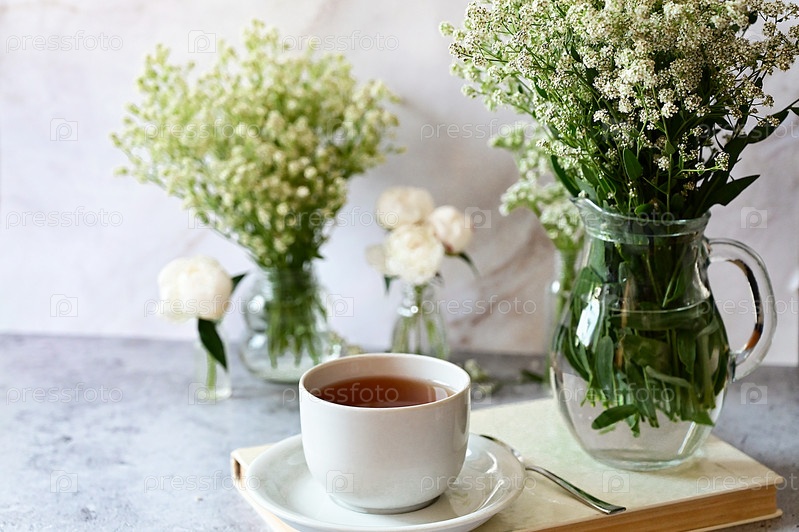 Свежая белая гипсофила, пионы на белом фоне. Дата свадьбы. Приглашение на праздник. Поздравление. Пустое место для текста. Вид сверху