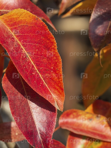 Красивые красно-оранжевые листья груши осенью. Красные осенние листья крупным планом на фоне размытых разноцветных листьев и место для текста