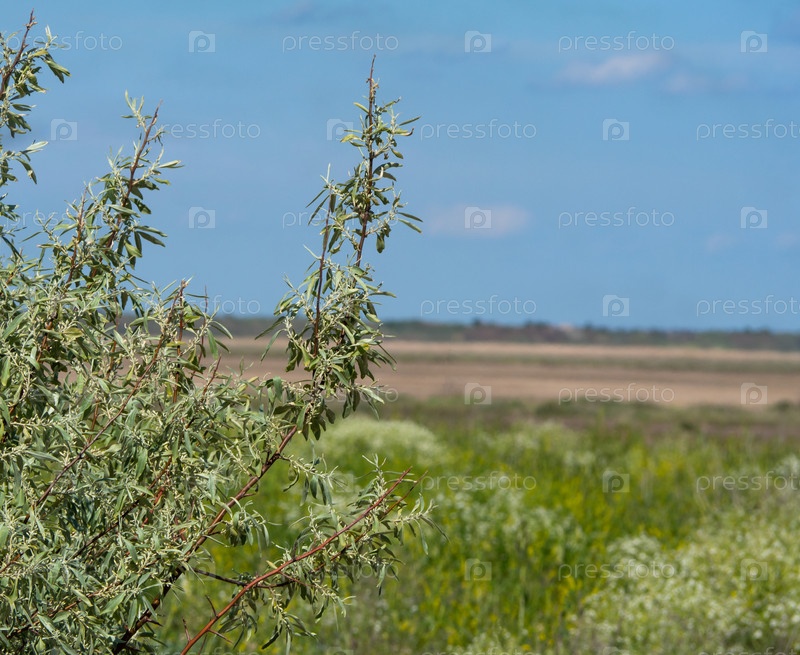 Обои Silverberry Elaeagnus commutata, ветви с маленькими серебряными плодами на фоне голубого неба, красивое растение