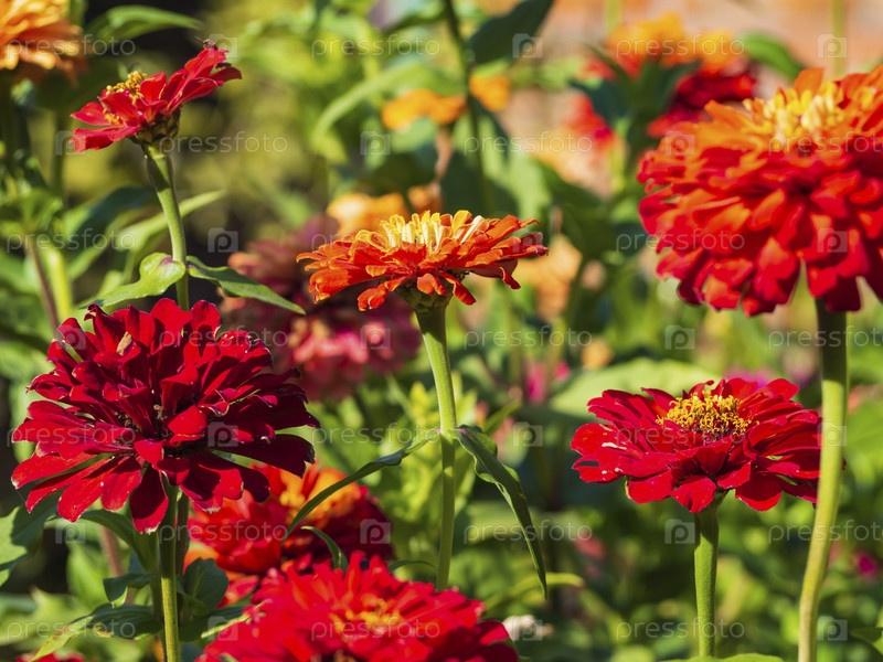 Крупный план ярко-красных цветов циннии, расцветающих на размытом фоне цветков и листьев в саду.На клумбе растут бархатники - Zinnia vulgaris (Zinnia elegans)