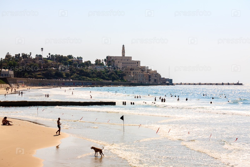 Вид на набережную Яффо. Люди отдыхают на пляже Тель Барух в Тель-Авиве