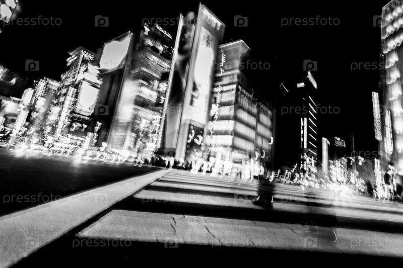 Пешеходы переходят улицу в центре района Гиндза в Токио. Переправа Гиндза ночью. Размытое движение