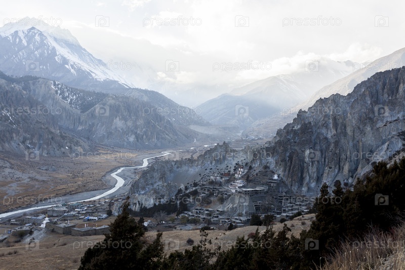 Небольшая горная деревня Брага (Брака) в Непале, Гималаи, заповедник Аннапурна