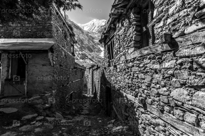 Улица в маленькой горной деревне Мананг в Непале, Гималаях, заповеднике Аннапурны