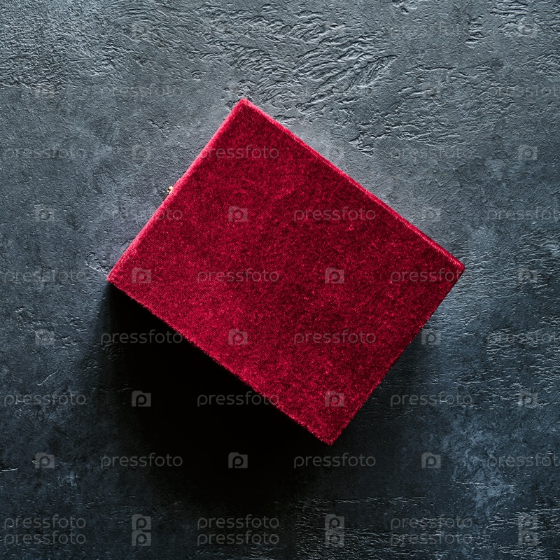 Подарочная бархатная коробка на сером фоне, вид сверху, крупный план