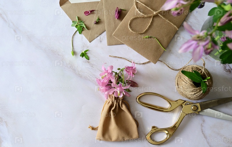 Розовые и голубые цветы, открытка, крафт, шпагат. Макет женского дня или Дня матери, Дня святого Валентина, плоский, вид сверху