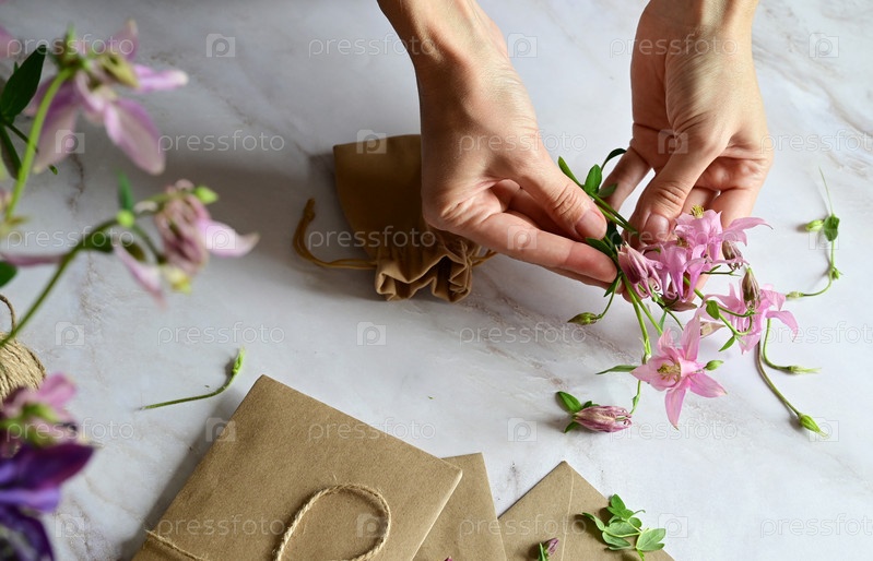 Розовые и голубые цветы, открытка, крафт, шпагат. Макет женского дня или Дня матери, Дня святого Валентина, плоский, вид сверху