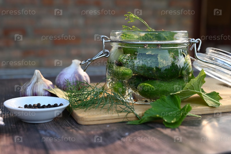 Набор ингредиентов для засолки огурцов, маринованные огурцы, рассол