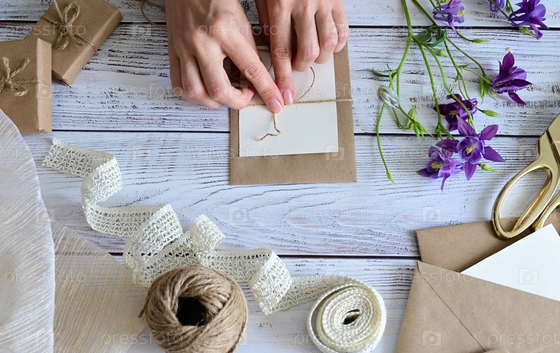 Розовые и голубые цветы, открытка, крафт, шпагат. Макет женского дня или Дня матери, Дня святого Валентина, плоский, вид сверху