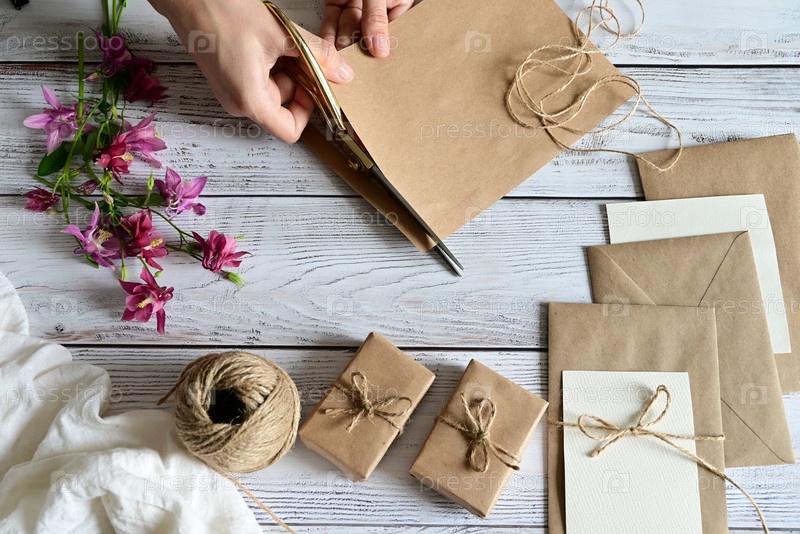 Розовые и голубые цветы, открытка, крафт, шпагат. Макет женского дня или Дня матери, Дня святого Валентина, плоский, вид сверху