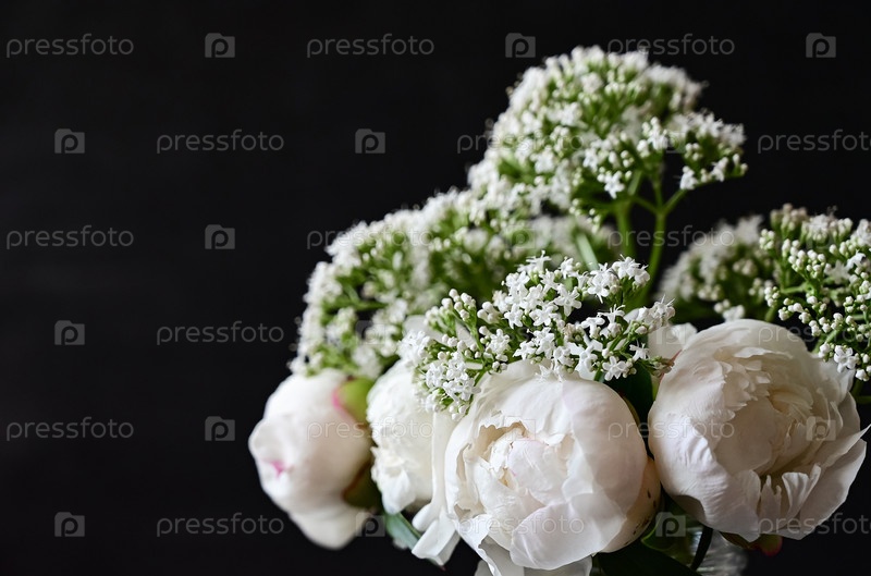 Свежие белые пионы на черном темном фоне. Открытка. Дата свадьбы. Приглашение на праздник. Поздравление. Пустое место для текста. Вид сверху. Он лежал ровно