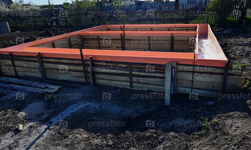 Деревянная опалубка с металлической арматурой, подготовленная для заливки бетона. Монтаж с помощью проволоки. Строительство нового дома