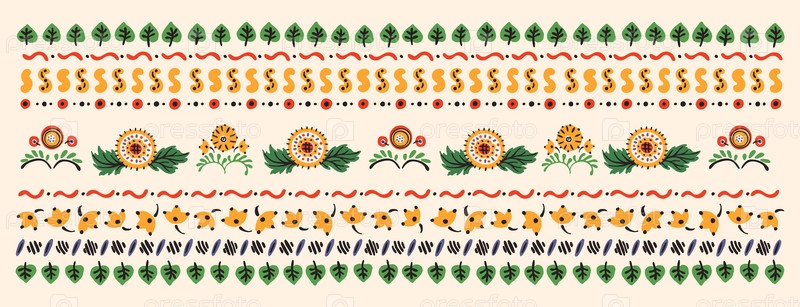 Набор этнических элементов. Бордюр представляет собой полосу с цветами, листьями, ветками, вензелями. Народная вышивка. Славянский, украинский, русский мотив. Хохлома, матрешка, дымковская игрушка. Мексиканский, индийский, цыганский ковер. Вязаное кружево