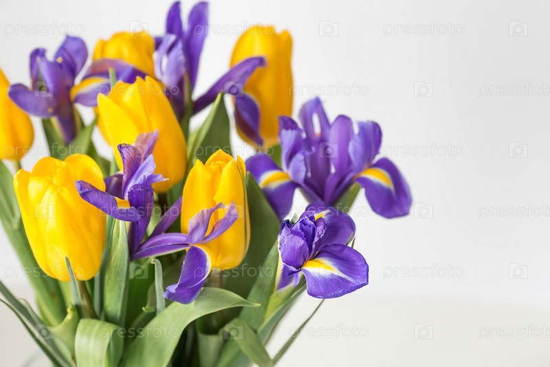 Букет желтых тюльпанов и фиолетовых ирисов на белом изолированном фоне. Концепция наступления весны и Международного женского дня 8 марта