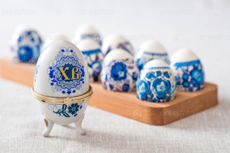 Большая коробка для яиц с надписью ХВ и пасхальные яйца в традиционном русском стиле на льняной скатерти на столе. Гжель. Концепция светлого праздника Пасхи