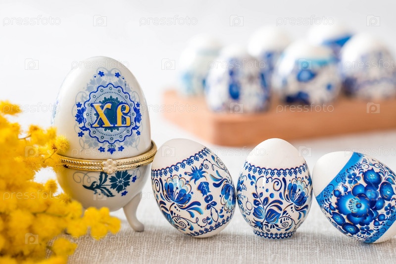 Большая яичная коробка с надписью XB, мимоза и пасхальные яйца в традиционном русском стиле на льняной салфетке на столе