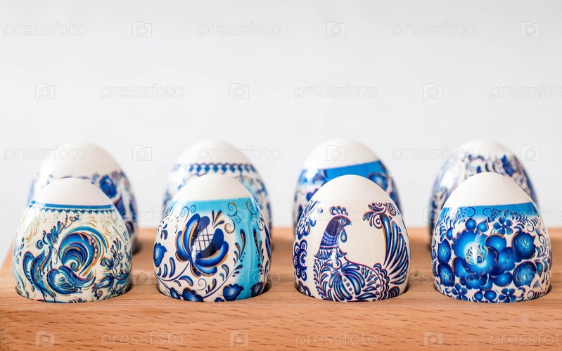 Большая коробка для яиц с надписью ХВ и пасхальные яйца в традиционном русском стиле на льняной скатерти на столе. Гжель. Концепция светлого праздника Пасхи
