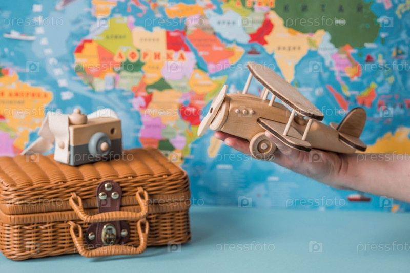 Туризм. Модель винтажного самолета и чемодан на фоне карты мира. Концепция путешествия, приключений и открытий