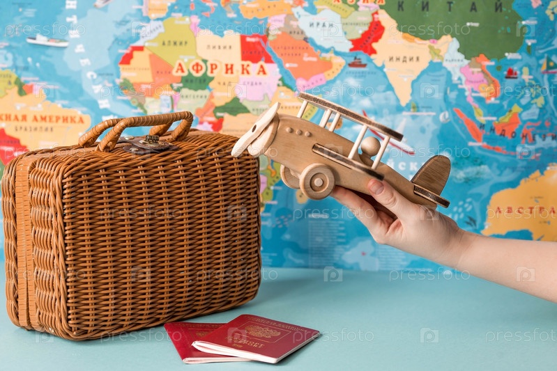 Туризм. Модель винтажного самолета, чемодан и российский паспорт на фоне карты мира. Концепция путешествия, приключений и открытий