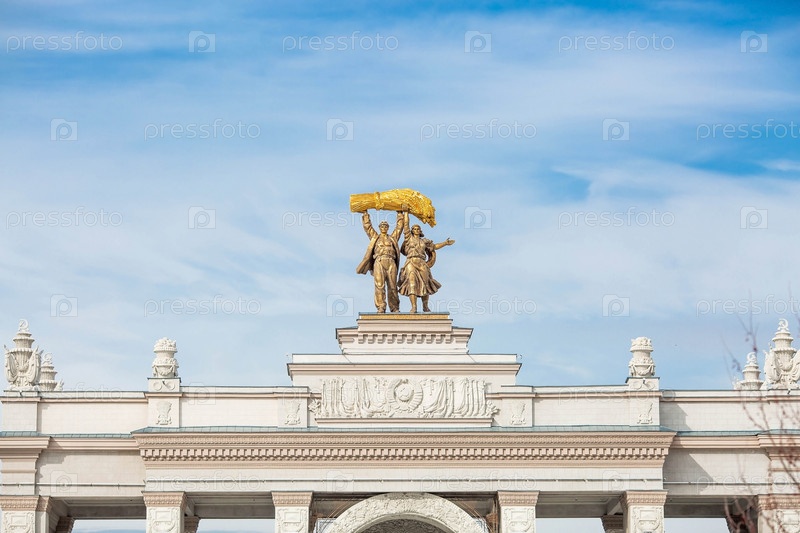 Крупный план. Скульптура на фоне голубого неба на крыше арки главного входа ВДНХ «Тракторист и колхозница» после реставрации. Россия, Москва, ВДНХ