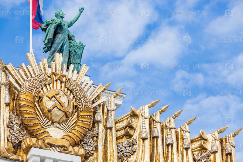 Золотой герб СССР на павильоне №1 «Центральный» на фоне ярко-голубого неба. Крупный план. ВДНХ. Москва. Россия
