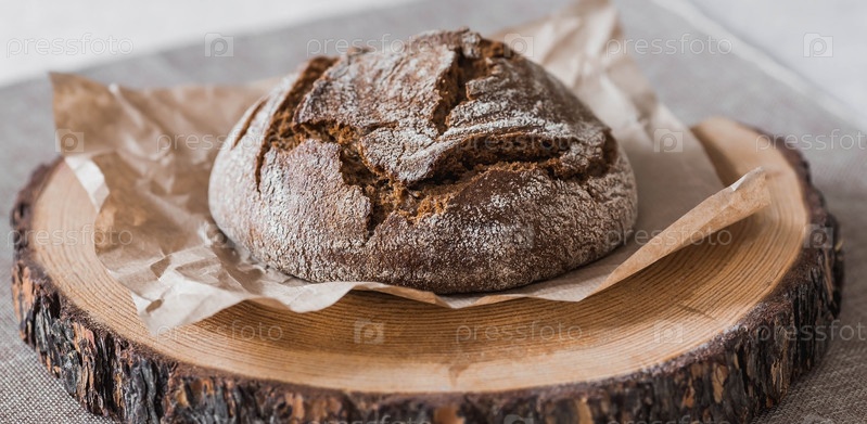 Свежий вкусный хлеб крупным планом. Свежеиспеченный хлеб на закваске с золотой корочкой на деревянной доске. Контекст пекарни с вкусным хлебом. Кондитерские изделия