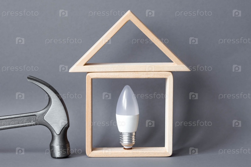 Идеи для ремонта дома. Модель деревянного дома, лампочка и молоток на сером фоне. Концепция ремонта и дизайн помещения