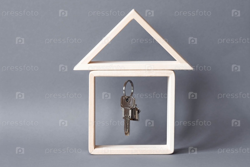 Ипотека. Покупка и аренда жилья. Модель деревянного дома и ключи от новой квартиры на сером фоне. Концепция приобретения жилья